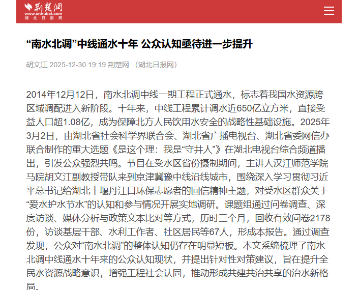 荆楚网刊发汉师马院胡文江副教授南水北调中线工程公众认知提升策略调研报告