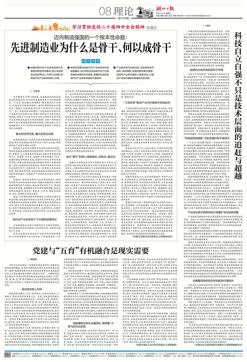 《湖北日报》作为我省主流权威媒体,其理论版是传播思想理论、凝聚价值共识、解读政策内涵的重要平台,聚焦重大理论与现实问题,兼具政治性与学术性,在全省乃至全国都具有广泛的思想影响力。此次刊发的《科技自立自强不只是技术层面的追赶与超越》,紧扣科技创新核心主题,围绕党的二十届四中全会审议通过的《中共中央关于制定国民经济和社会发展第十五个五年规划的建议》中“加快高水平科技自立自强,引领发展新质生产力”的要求和系统部署,立足理论前沿与实践热点展开深入探讨。